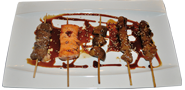 Assortiment de 7 brochettes : 1 saumon, 2 boeuf-fromage, 2 champigons, 2 poulet, accompagnées d'un bol de riz |